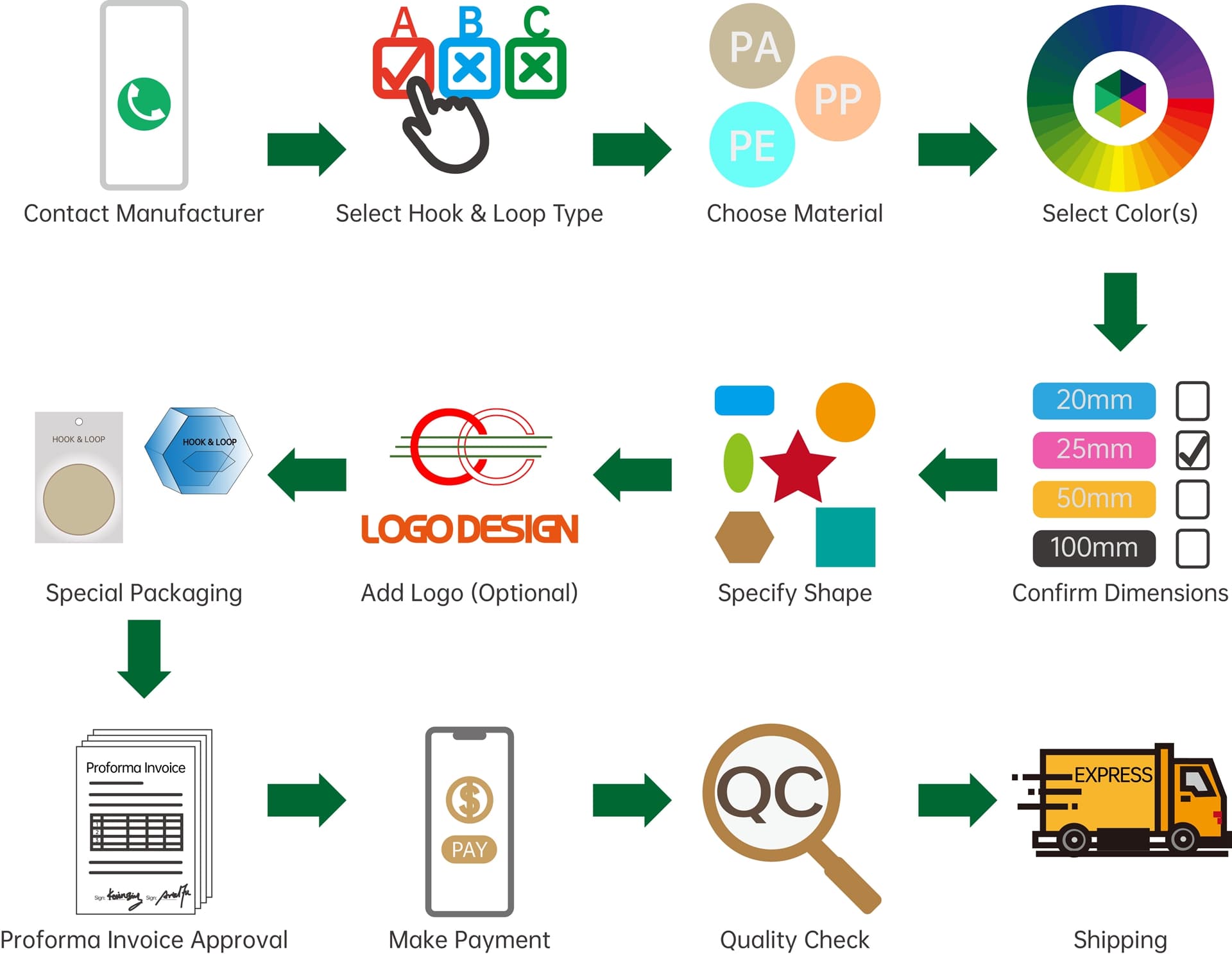 Thank you for your interest in our custom hook and loop products. To ensure a clear and efficient experience, we have outlined our standard ordering process below. This transparent workflow will guide you from initial contact to final delivery.